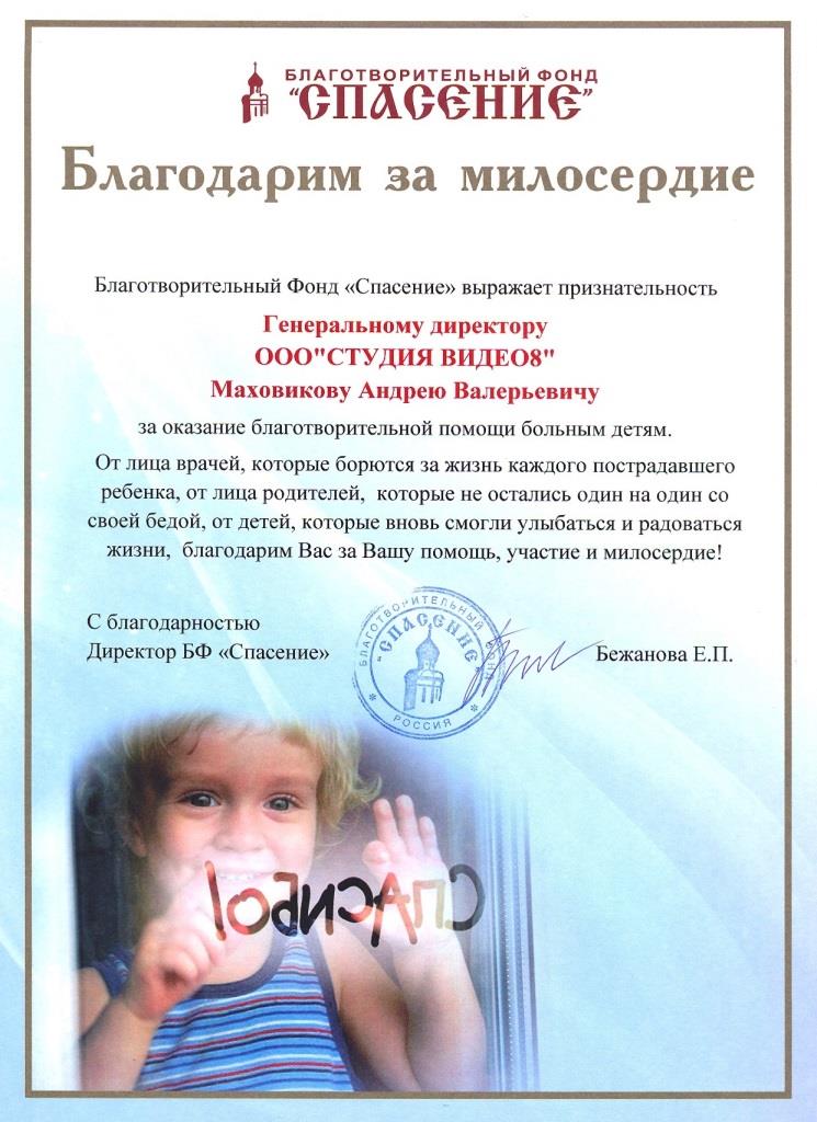 Благотворительный Фонд "Спасение" выражает признательность генеральному директору ООО "Студия Видео8" Маховикову А.В. за оказание благотворительной помощи больным детям.
